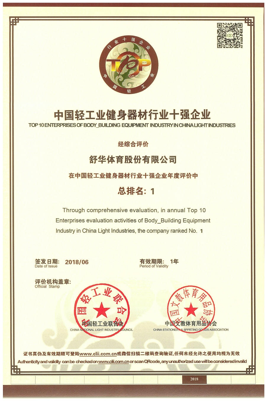 2018 中国轻工业健身器材行业十强企业 中国轻工业联合会/中国文教体育用品协会 荣誉证书 查看